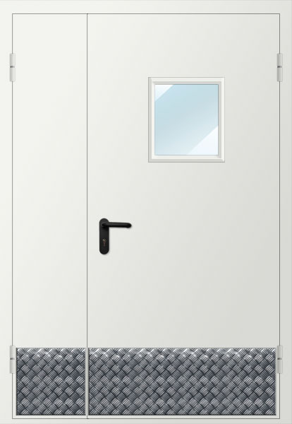 Дверь двупольная металлическая противопожарная с остеклением изготавливается по индивидуальным размерам на нашем собственном производстве. Полотно и рама двери выполнена из металла 1,2 или 1,4 мм. Цвет двери может быть абсолютно любой по шкале RAL, используем порошковое напыление. Качественная упаковка обеспечит доставку в другой регион без рисков. Срок изготовления в среднем занимает 7 дней.