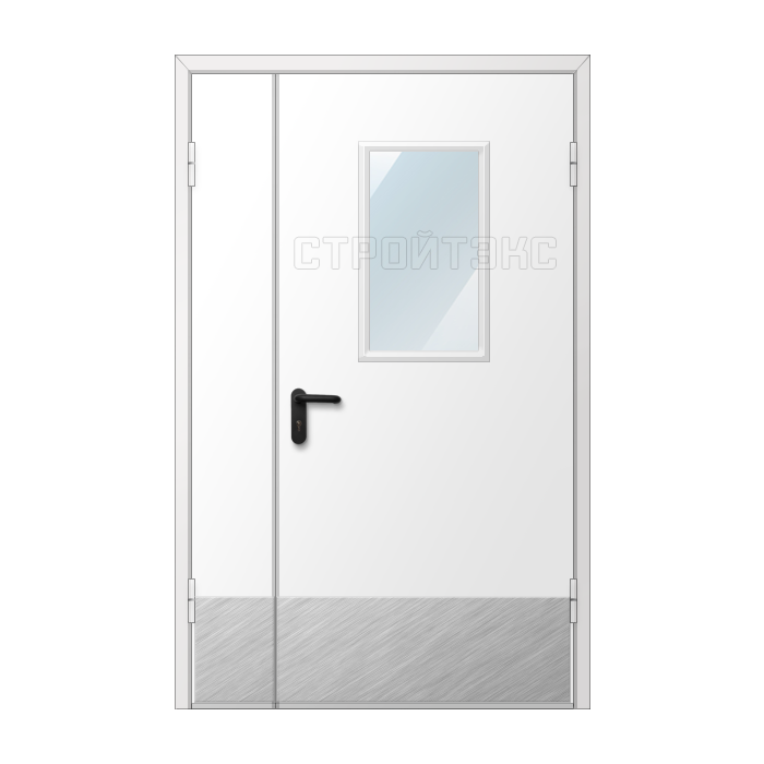 Дверь двупольная металлическая противопожарная с остеклением изготавливается по индивидуальным размерам на нашем собственном производстве. Полотно и рама двери выполнена из металла 1,2 или 1,4 мм. Цвет двери может быть абсолютно любой по шкале RAL, используем порошковое напыление. Качественная упаковка обеспечит доставку в другой регион без рисков. Срок изготовления в среднем занимает 7 дней.