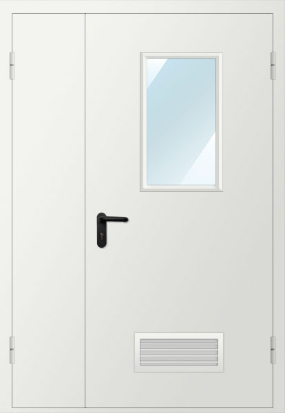 Дверь двупольная металлическая с вентиляционной решеткой и остеклением 300х600